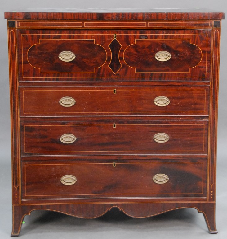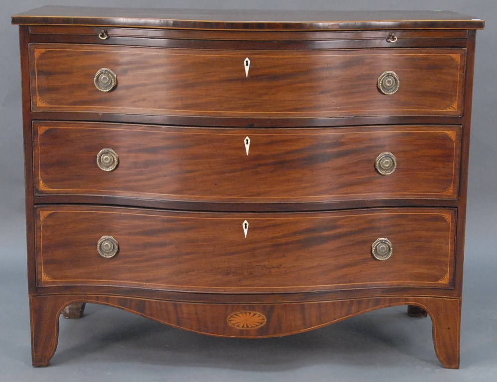 Mahogany chest of three drawers having serpentine top over conforming case with pull out slide over three drawers set on small bracket feet, drawers with fan and line inlays, skirt with oval panel inlay. ht. 36in. wd. 44in.