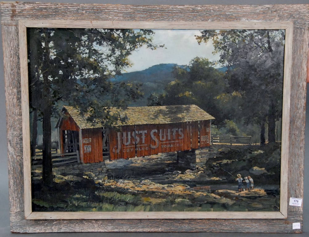 Eric Sloan 1905-1985 KIDS FISHING BY JUST SUITS RED COVERED BRIDGE oil on masonite signed and written lower left Sloane Vermont July Abercrombie & Fitch label on reverse written on reverse Eric Sloane New Milford, Conn. 23 x 31 1/2