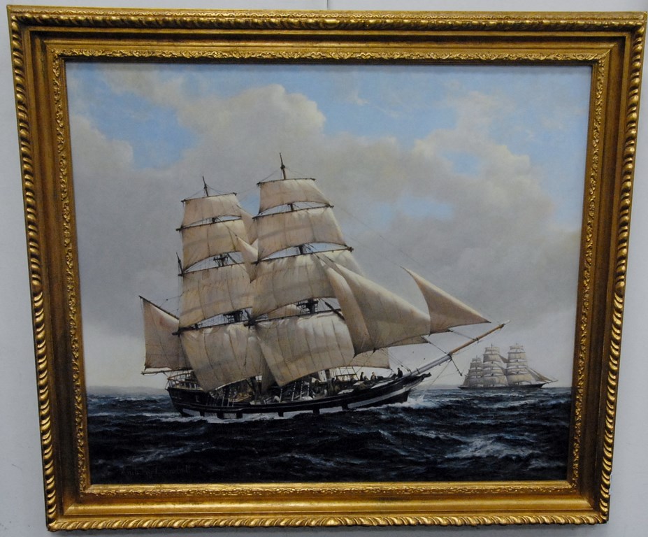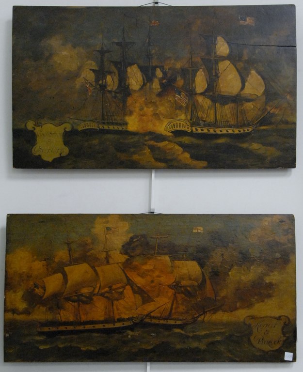 Pair of primitive oil on wood panels depicting battling American and British ships, one marked Hornet and Peacock 15 x 29 and one Constitution and Querriere signed lower right A. Chase 17 x 29. Provenance: Estate of Nancy Sachse, Hamden, Connecticut.
