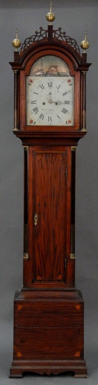 W. Cummens mahogany tall case clock, case with fret work top and three brass finials over tombstone glass, flanked by brass stop fluted quarter columns on case with long molded door with fan inlays flanked by brass stop fluted quarter columns all set on base with fan inlays on bracket feet, dial with rocking ship brass works, dial signed W. Cummens warranted. ht. 93in. wd. 18in. dp. 9in.