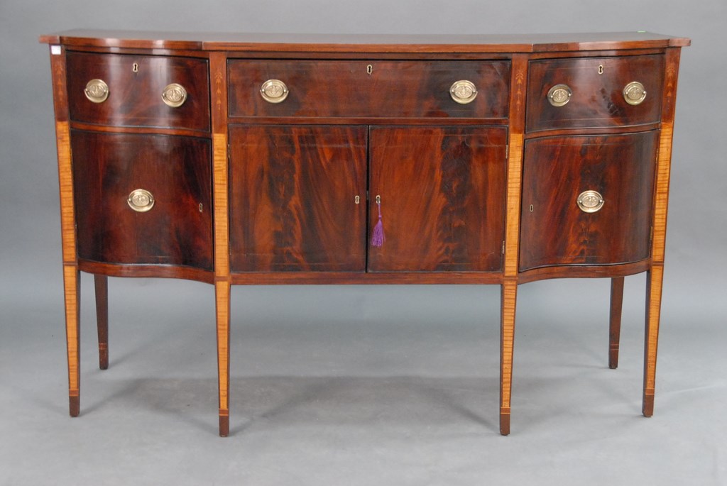 Federal mahogany sideboard having shaped top over three drawers over four doors all set on square tapered legs with tiger maple veneer panels. ht. 41 1/2in. lg. 65in. dp. 27in.