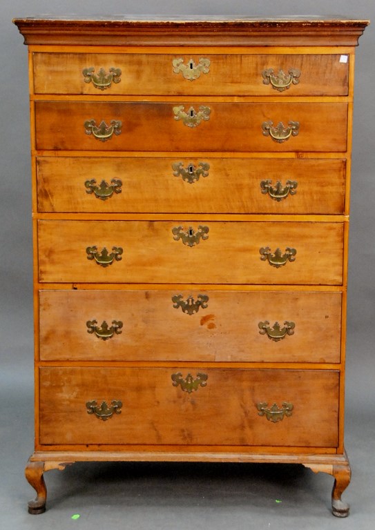 Maple tall chest with large cornice molding over six graduated drawers all set on short bandy legs ending in pad feet piece of bottom side molding missing. ht. 50in. wd. 37in. dp. 18in. Provenance: Estate of Nancy Sachse, Hamden, Connecticut