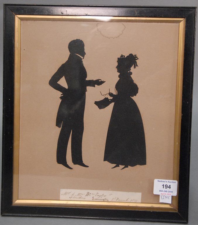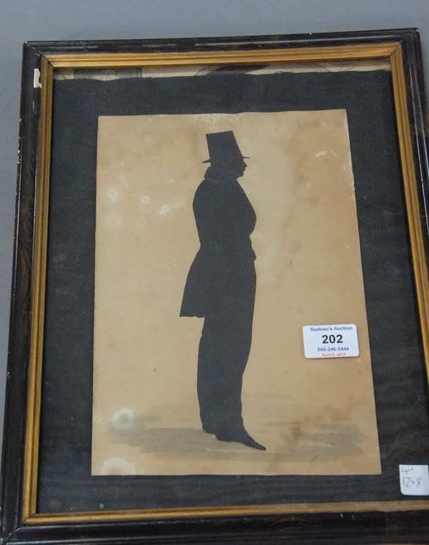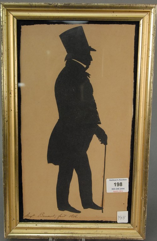 Silhouette of gentleman in top hat with cane, full length and turned to his left, signed on bottom Aug. Edouart 1826. Provenance: Estate of Nancy Sachse, Hamden, Connecticut 14 x 8