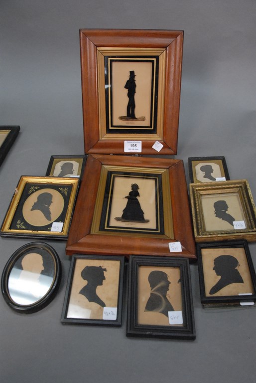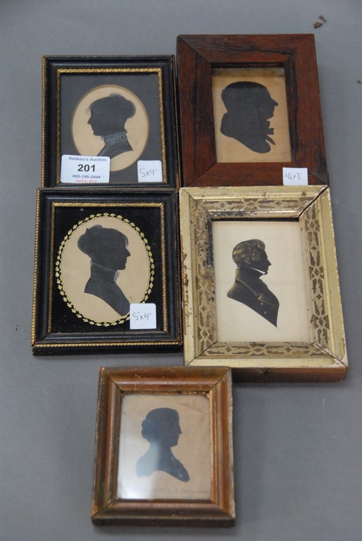 Group of five small silhouettes, two women and two men, one signed M. A. Honeywell, one paper impressed Baches Patent. Provenance: Estate of Nancy Sachse, Hamden, Connecticut 3 1/2 x 3 to 4 x 5