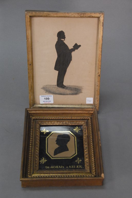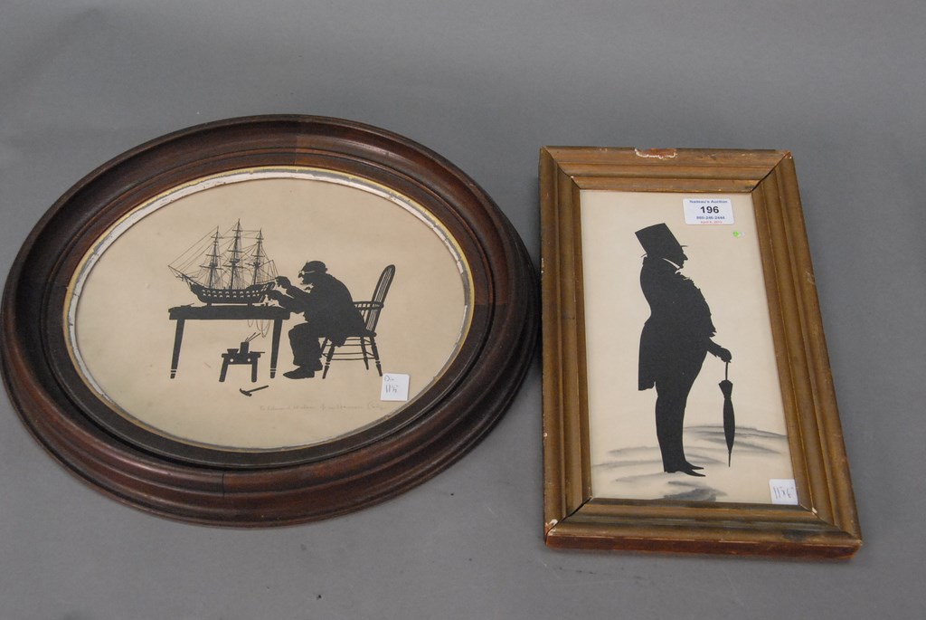 Two piece lot of silhouettes to include a model ship builder marked To Edward Wilson from Hanson Cady dia. 11 1/2in. a gentleman with an umbrella. 11 x 6 Provenance: Estate of Nancy Sachse, Hamden, Connecticut