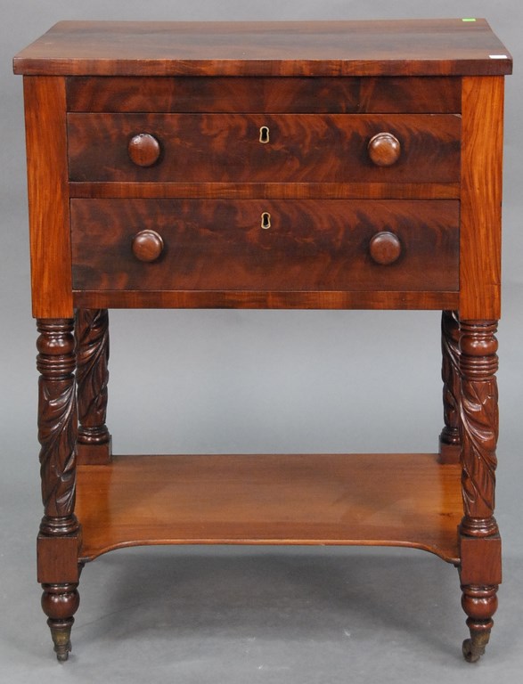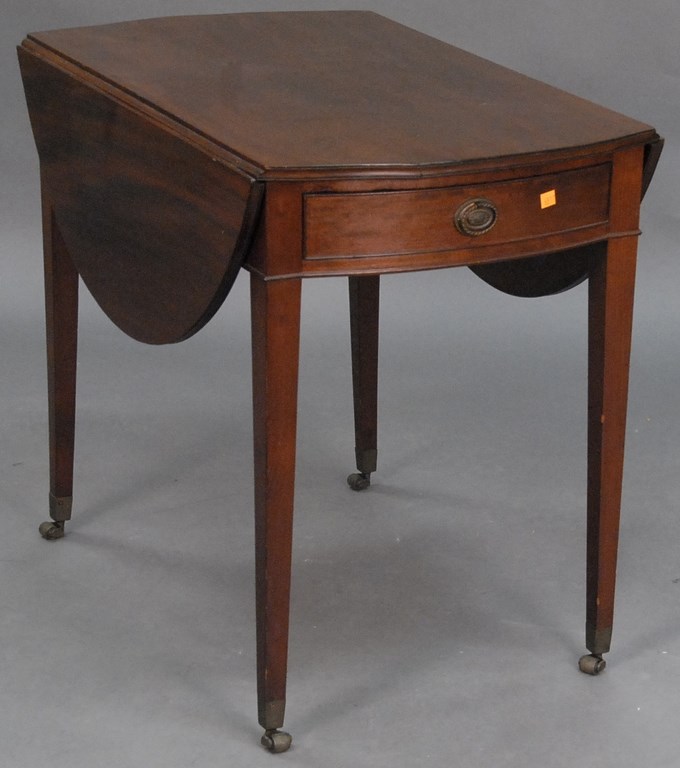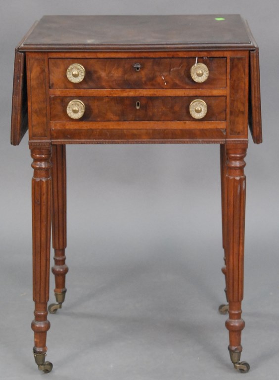 Sheraton mahogany work table with drop leaves and drawers plus bag drawer on fluted legs ending in brass capped feet and wheels. ht. 28in. wd. 18in. dp. 17in. Provenance: Estate of Nancy Sachse, Hamden, Connecticut.