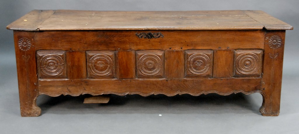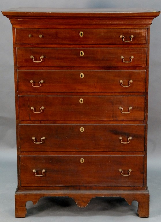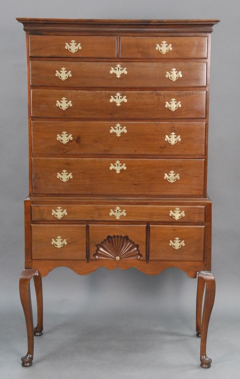 Queen Anne walnut high chest in two parts, upper section with large cornice molding over two drawers over four drawers on lower section with one long drawer over three short drawers, center drawer with shell carving with scalloped skirt, all set on cabriole legs ending in pad feet, probably Salem Massachusettes area, circa 1750. ht. 71in. wd. 36 1/2in.