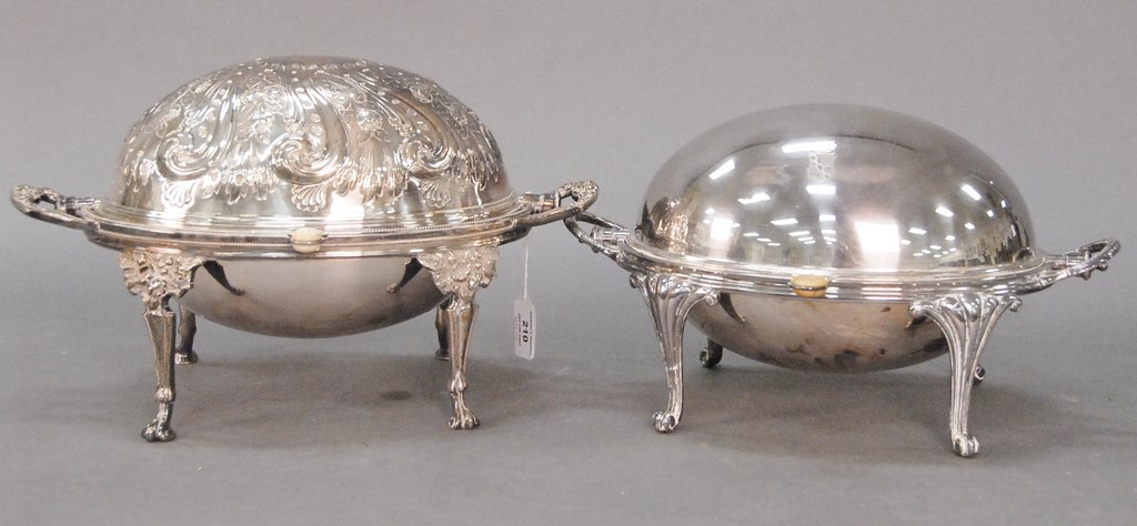 Two silverplated revolving tureens with ivory handles, one with repousse cover and the other with coat of arms. ht. 9in. lg. 14in. & ht. 4in. lg. 13in.