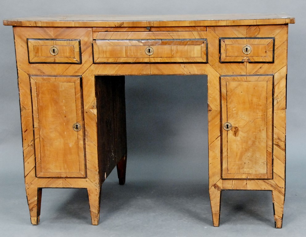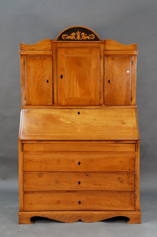 Fruitwood Biedermeyer type secretary desk in two parts, upper section with three doors on lower section with drop front desk over three drawers on bracket base with inlaid panels and lines no hardware. ht. 75in. wd. 46in. dp. 21 1/2in..