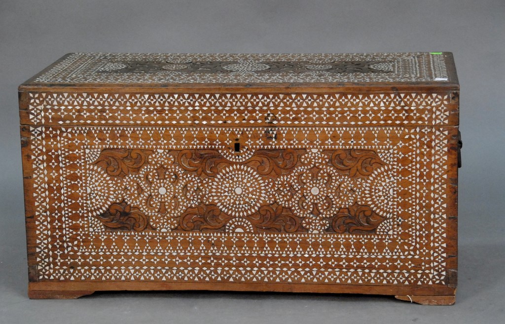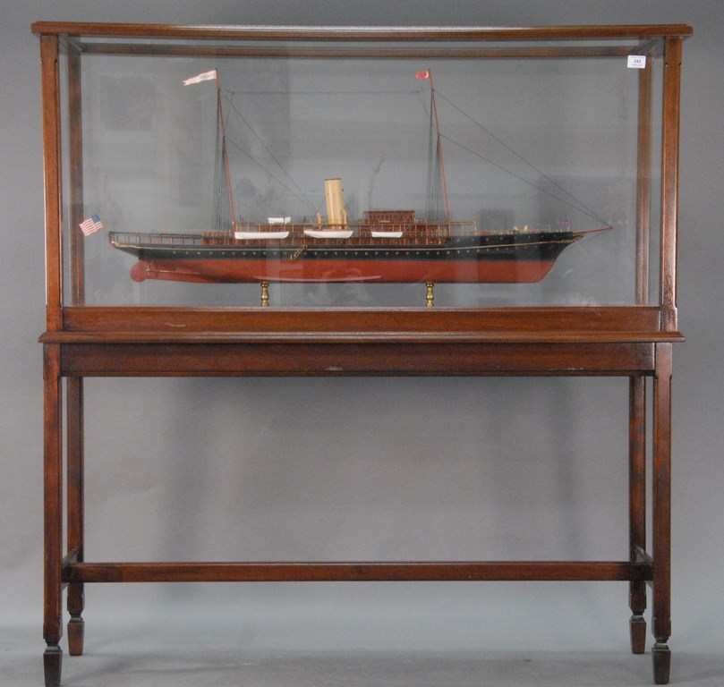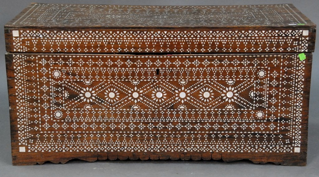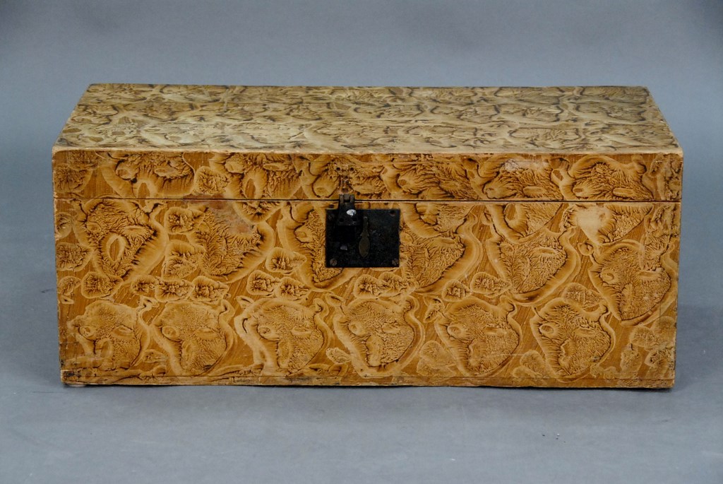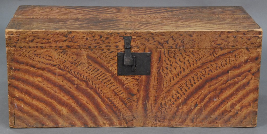 Sheraton captain’s chest made in two parts, each with tiger maple drawer fronts and each section with large brass carrying handles with desk compartment in second drawer, set on turned legs, circa 1830-1840. ht. 46in. wd. 43in. dp. 22in.