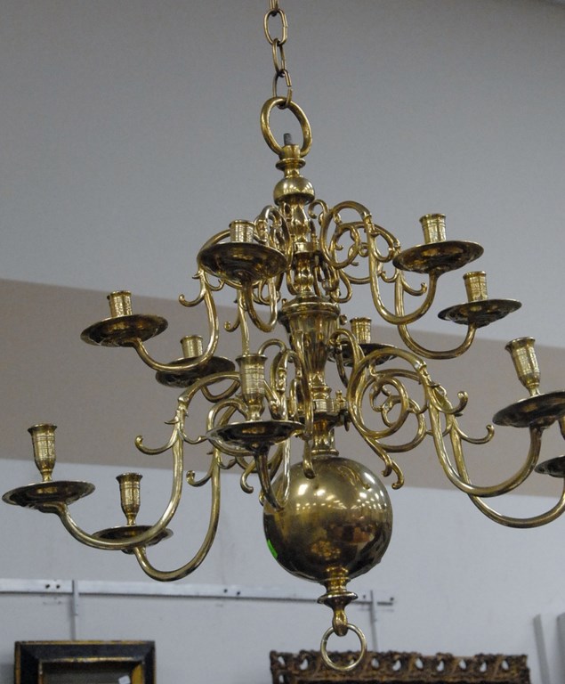 Pair of brass candlesticks made into table lamps with faux candle tops, large drip catchers all set on three scrolled feet, 19th century. candlestick ht. 12in.