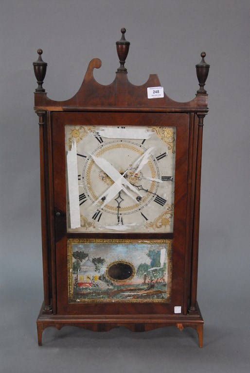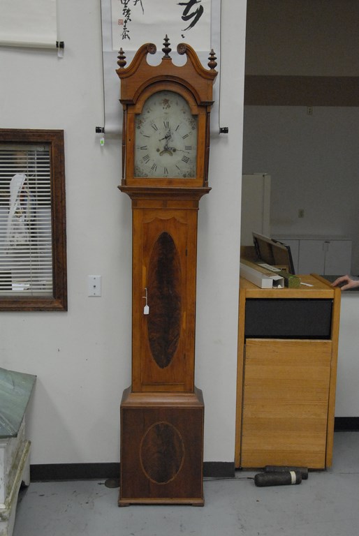 Federal cherry and birch tall case clock with broken arch top with tombstone door over oval panel inlaid door on base with oval panel inlay, American brass works and enameled metal dial. ht. 84in. wd. 13in.