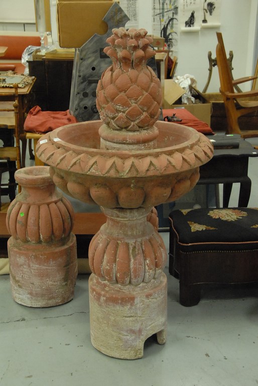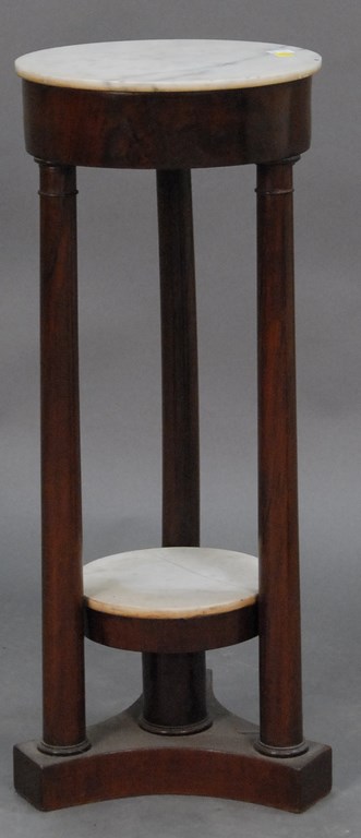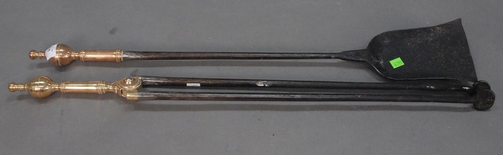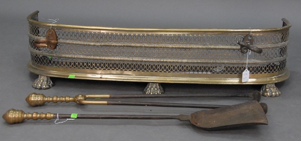 Five piece lot to include a pair of Federal brass andirons and three brass top fire tools. andirons: ht. 20in. tools: ht. 30in. Provenance: Brown Family, Windsor, Connecticut