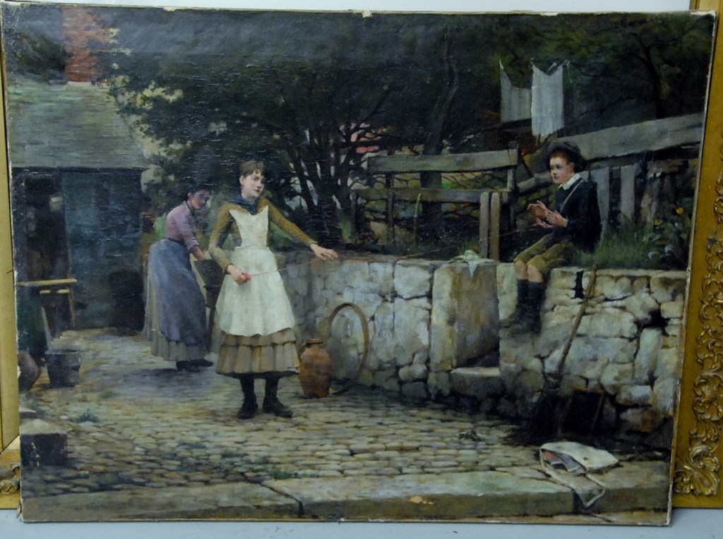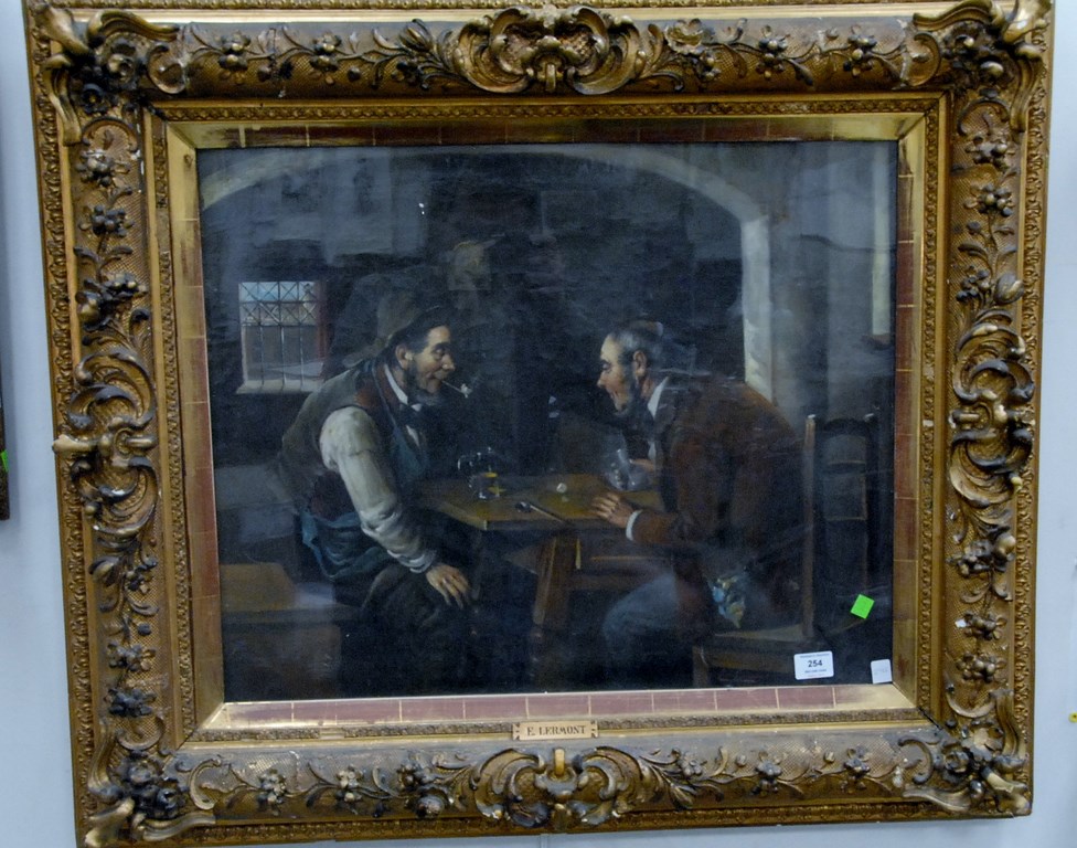 E. Lermont CONTINENTAL INTERIOR SCENE two men drinking and smoking oil on canvas under glass signed lower right E. Lermont elaborate gold Victorian frame 27 x 22