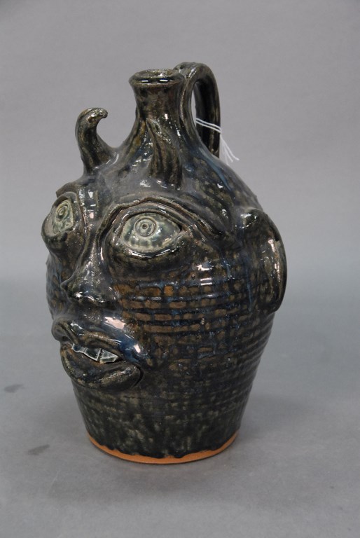 Brass figural inkstand having seated classical figure, two crystal bottles each with heavy brass tops, and pen tray, marked Eugene Allison 1873 one bottle cracked. ht. 12in. lg. 14in.
