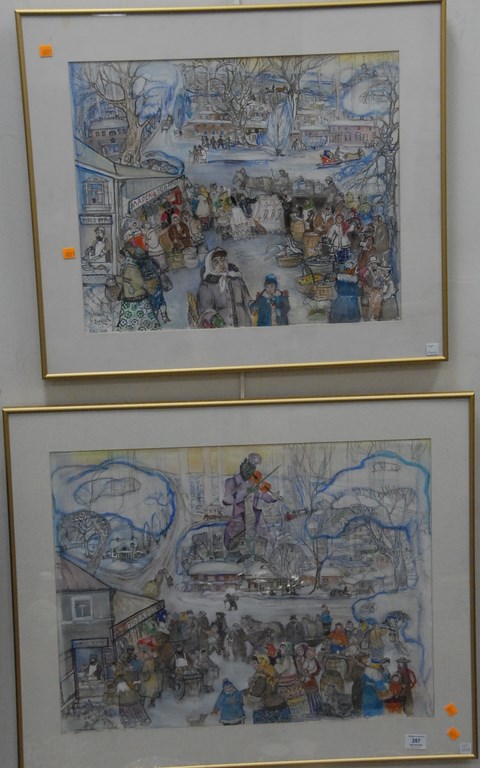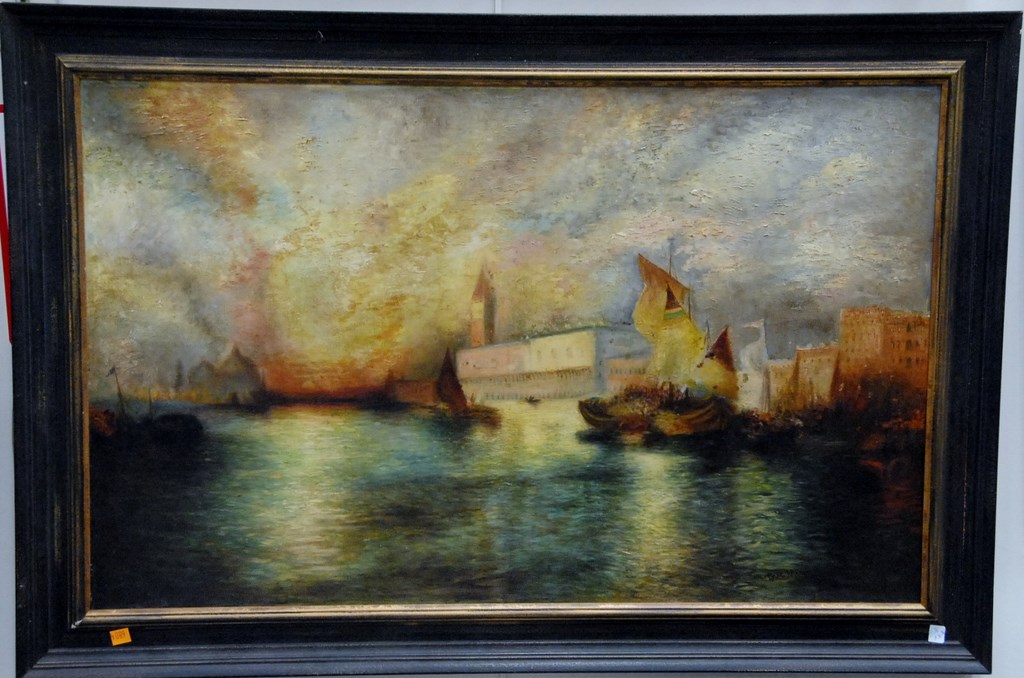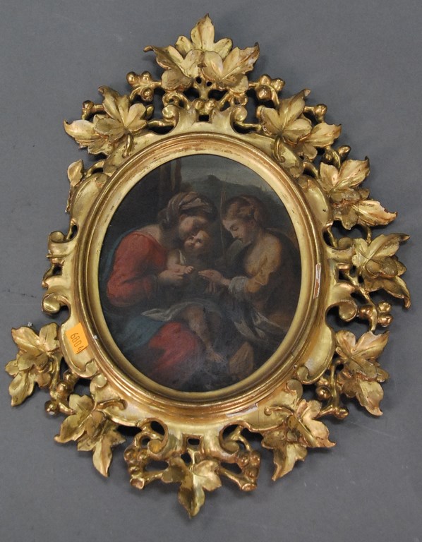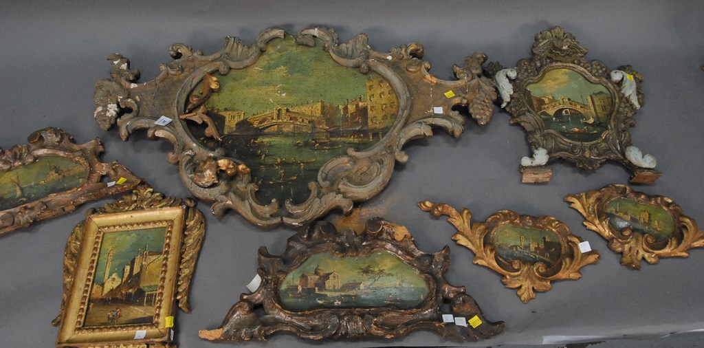 Seven piece lot of Venetian style paintings with elaborate frames. Provenance: property from a home in Rockville Center, New York which was decorated by Iris Apfel. 4 1/2 x 6 to 9 1/2 x 12