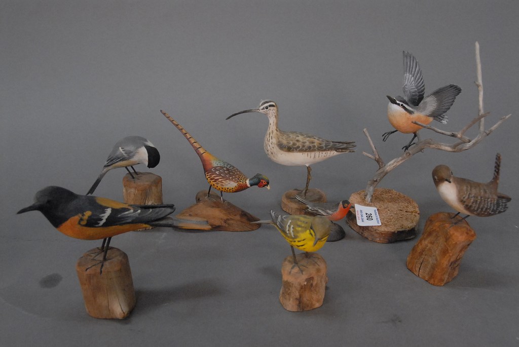 Eight miniature wood birds, various types including Peter Peltz, Stan Sparre and one attributed to A. E. Crowell. ht. 2in. to 8in. Provenance: Estate of Nancy Sachse, Hamden, Connecticut