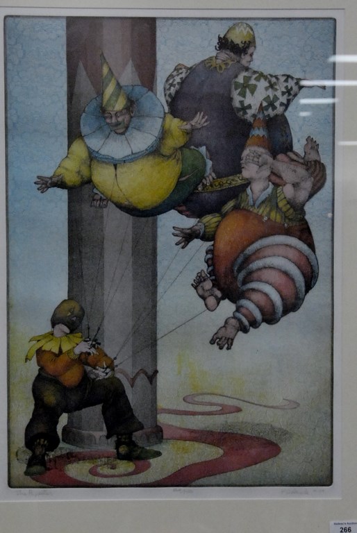 Charles Klabunde American 1935 THE PUPPETEER colored etching signed lower right Klabunde 79′ numbered lower center 34/150 titled lower left The Puppeteer plate size 23 1/2 x 16 1/2