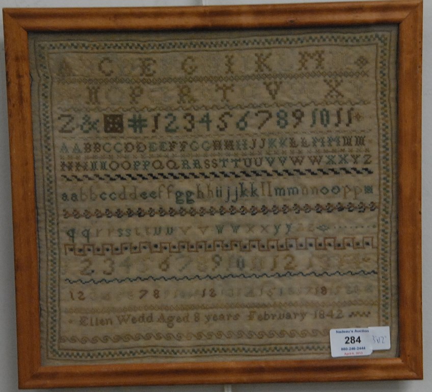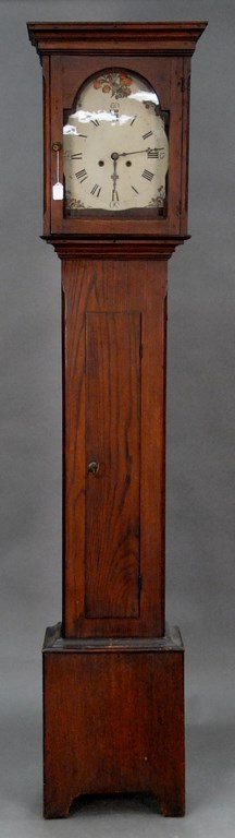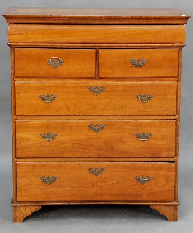Diminutive cherry Queen Anne high chest in two parts, upper section with flat top over four graduated drawers on base with three short drawers with cyma carved skirt on tall cabriole legs ending in pad feet brasses changes and two drawers chipped. ht. 63 1/2in. upper section wd. 31 3/4in. lower section 34in. Provenance: Phelps-Brown Family, Windsor, Connecticut Note: bottom drawer of upper case signed Johsua Case Simsbury 1761 Ruth case married Eli Phelps of Windsor CT, circa 1775. According to family tradition a high chest was made for her by a relative, possibly her cousin, Simsbury Joiner Joshua Case 1723-1778