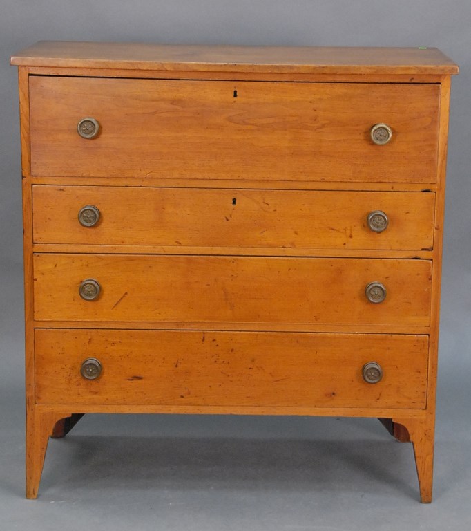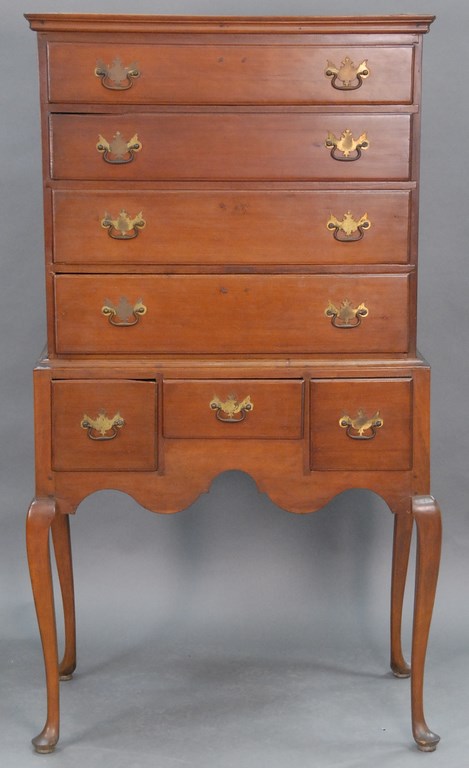 Queen Anne highboy top having one drawer in top molding over two short drawers over three long drawers on added short bracket base. ht. 44in. wd. 38in. Provenance: Brown Family, Windsor, Connecticut