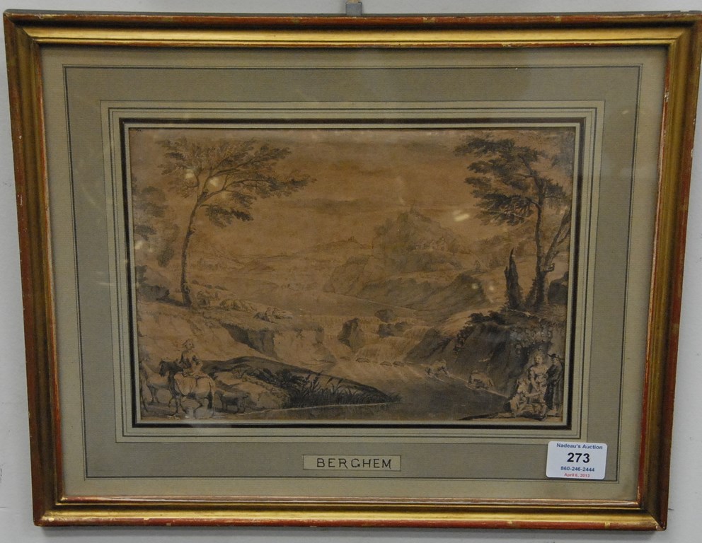 Attributed to Nicolaes Berghem Old Master LANDSCAPE PEOPLE AND SHEEP with town in the distance graphite pencil drawing on paper marked on blotter with attribution to Berghem probably 18th century 8 x 10 1/2