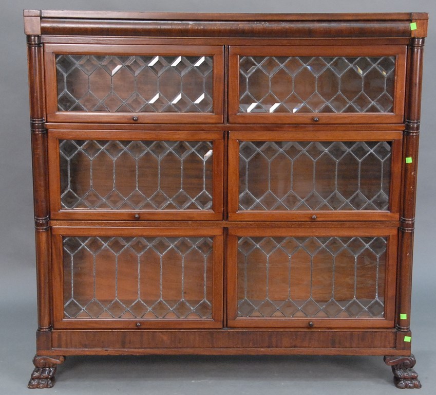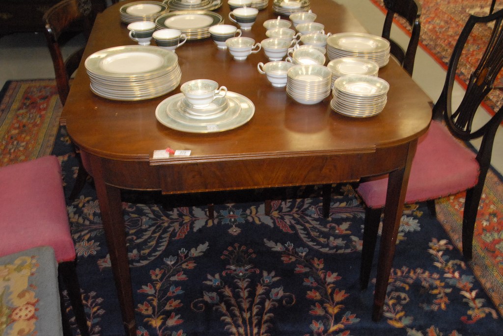 Margolis mahogany Federal style dining table with D shaped ends over conforming frieze all set on square tapered legs with four 12 inch leaves, signed Margolis in need of refinishing. ht. 30in. top: 43 x 61 opens to 109