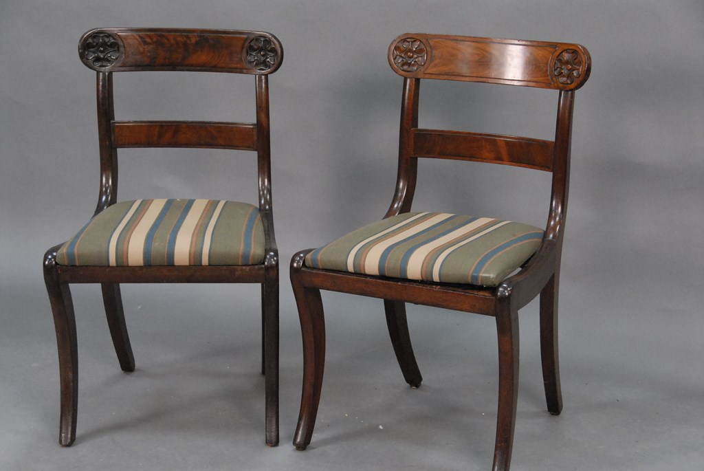 Set of six Queen Anne style dining chairs having typical Queen Anne splat and slip seats on cabriole legs ending in pad feet and block and turned stretchers, in old finish, early 20th century.