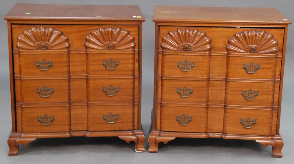 Pair of signed Margolis mahogany cabinets with carved block fronts and four faux drawers as doors opening to reveal stereo, speaker, and shelf, signed Margolis with brand mark can be used as side tables. ht. 27in. wd. 26in. dp. 18in.