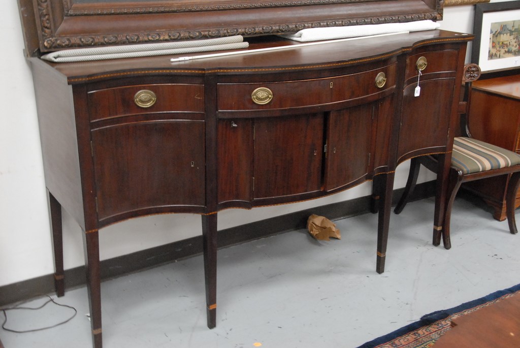 Margolis mahogany Federal style sideboard with shaped top over conforming case with one long and two short drawers over four doors and two bottle drawers all on square tapered legs, case with dart inlays, signed Margolis in drawer with hand written label 1919. ht. 41 1/2in. wd. 72in. dp. 28in.