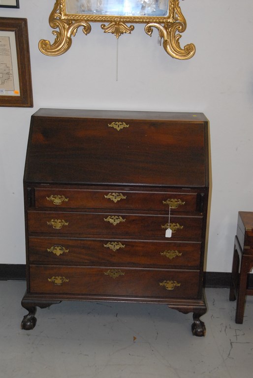 Margolis Chippendale mahogany slant lid desk over four drawers set on ball and claw feet, signed with paper label 1909 Nathan Margolis. ht. 41in. wd. 34in.