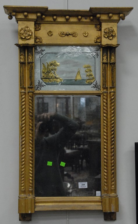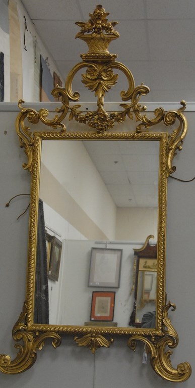 Chippendale Continental mirror with original gilt, basket of flowers top on openwork scrolls, rectangular mirror, and scrolled legs, probably 18th century. total ht. 53in. wd. 30 1/2in. Provenance: Estate of Judy McDonough Gengras of Stoner Drive, West Hartford, Connecticut.