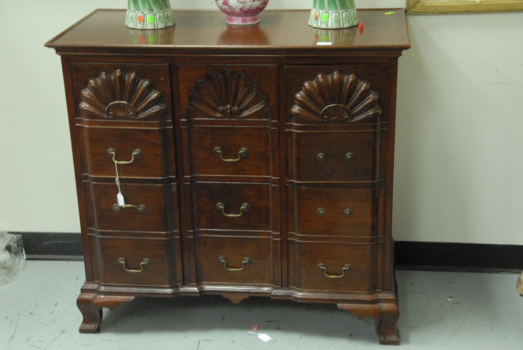 Margolis custom mahogany chest having dished rectangular top, front with triple shell carving and four short center drawers flanked by two doors which are false drawers set on ogee feet with back center board opening to inside, signed Margolis with brand mark Harold Margolis. ht. 35in. wd. 38in. dp. 19in.