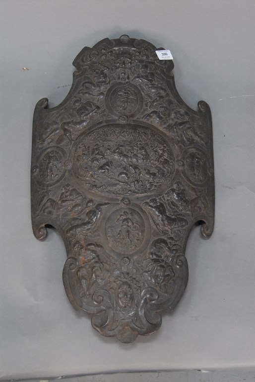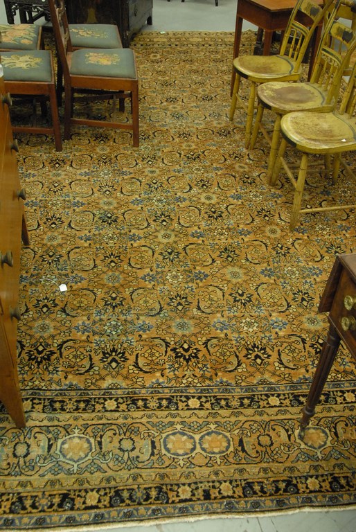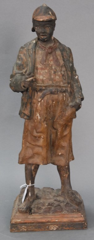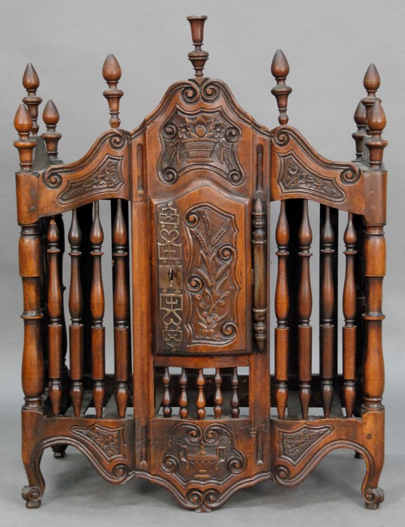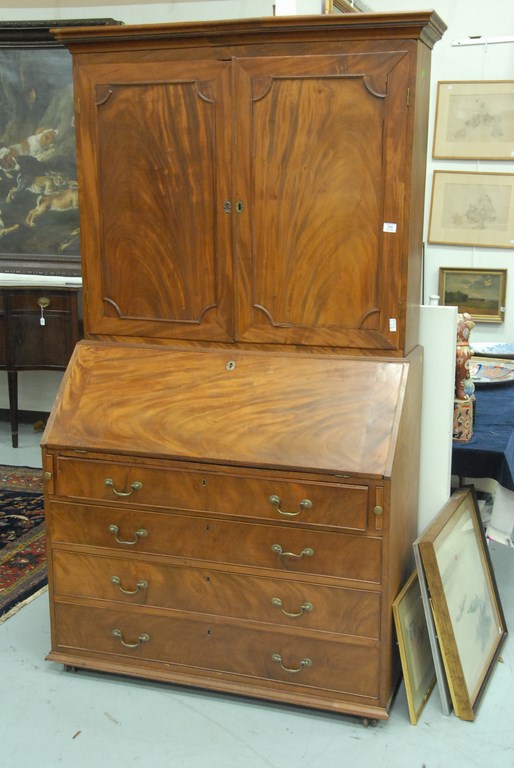 Chippendale mahogany secretary desk in two parts, upper section with bookcase top and two blind doors over lower section with slant lid over four drawers, interior with block and shell carving, the whole of figured mahogany, original brasses, 18th century probably Norwich, Connecticut no feet. ht. 84in. wd. 46in. dp. 22in. Provenance: originally in C.P. Hamlen’s office in Allis Howe Building of Norwich Free Academy.