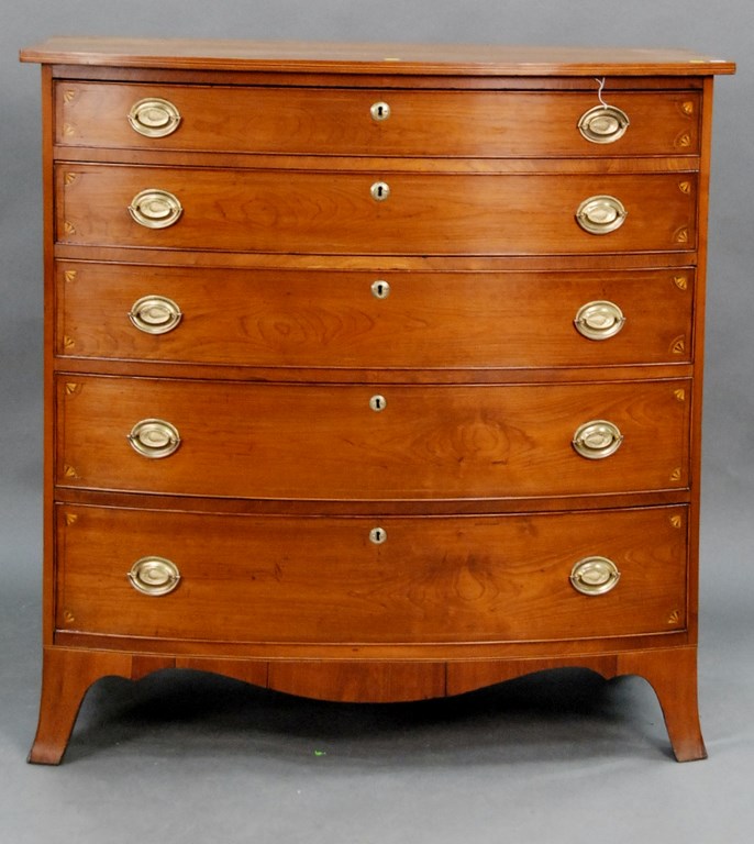 Federal cherry chest having bow front top over conforming case of five graduated drawers all with fan and line inlays set on French feet, circa 1790-1810. ht. 43in. wd. 42in. dp. 22 1/2in.