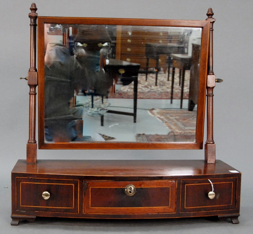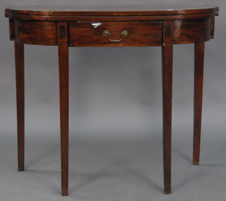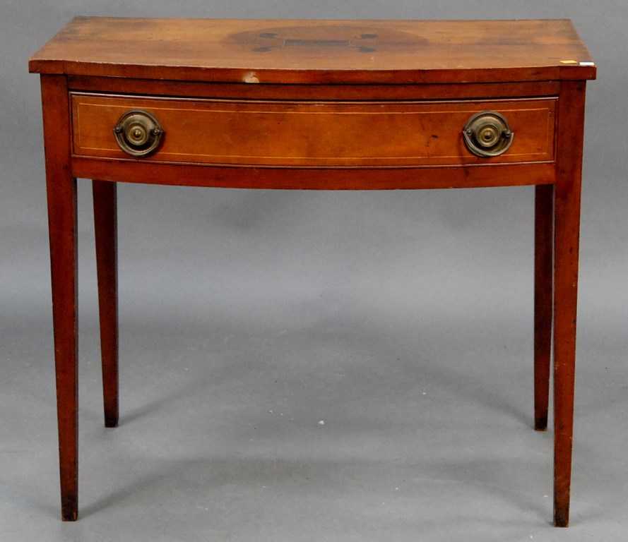 Federal cherry server having inlaid top with bowed front and one long drawer set on square tapered legs, Connecticut circa 1790-1810. ht. 28in. wd. 30in. dp. 19in.