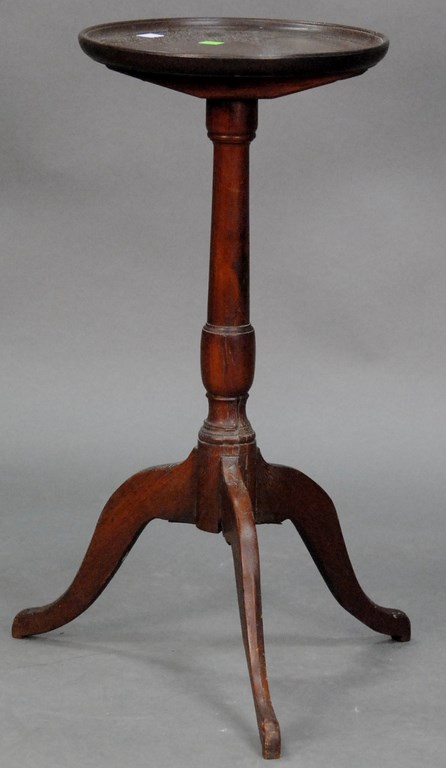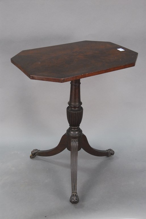 Mahogany tip table with shaped top on turned shaft with fluted urns on carved tripod base ending in paw feet, in the manner of Duncan Phyfe, 19th century. ht. 29in. wd. 18in. lg. 24in.