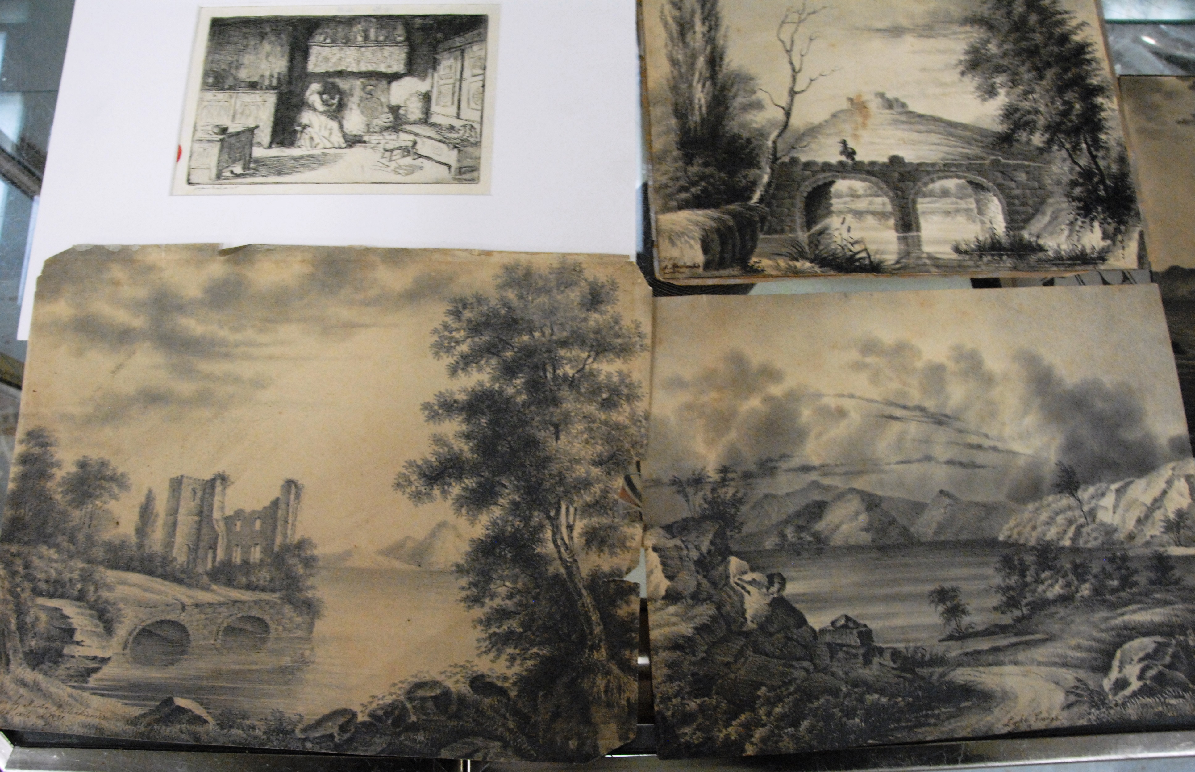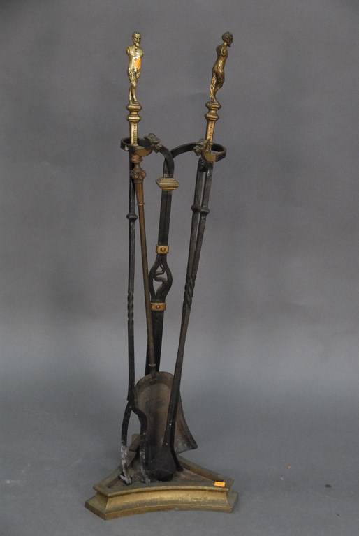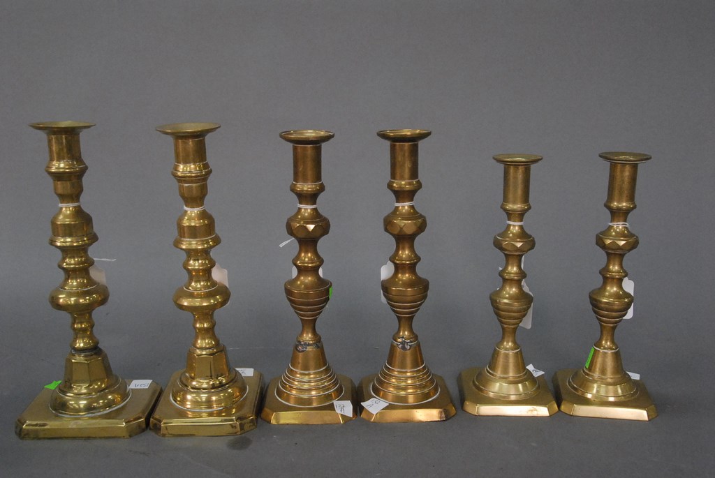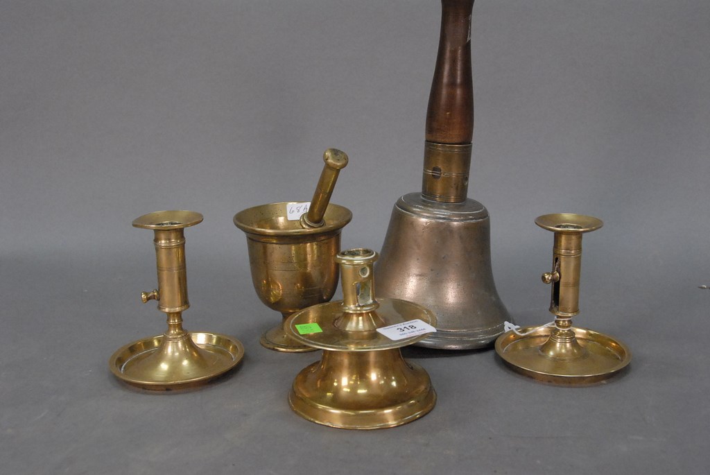 Five piece brass lot 17th – 18th century candlestick, pair of brass candlesticks, mortar and pestle, and classroom bell with wood handle. candlestick: ht. 5in. pair of candlesticks: ht. 6in. mortar and pestal: ht. 8in. bell: ht. 14in.