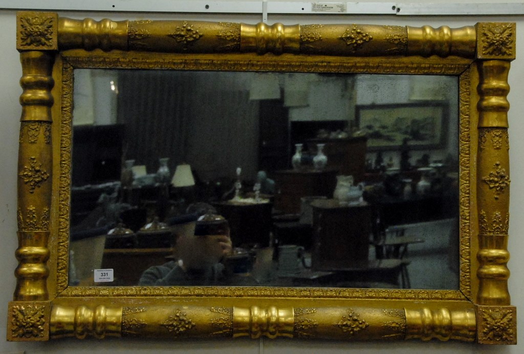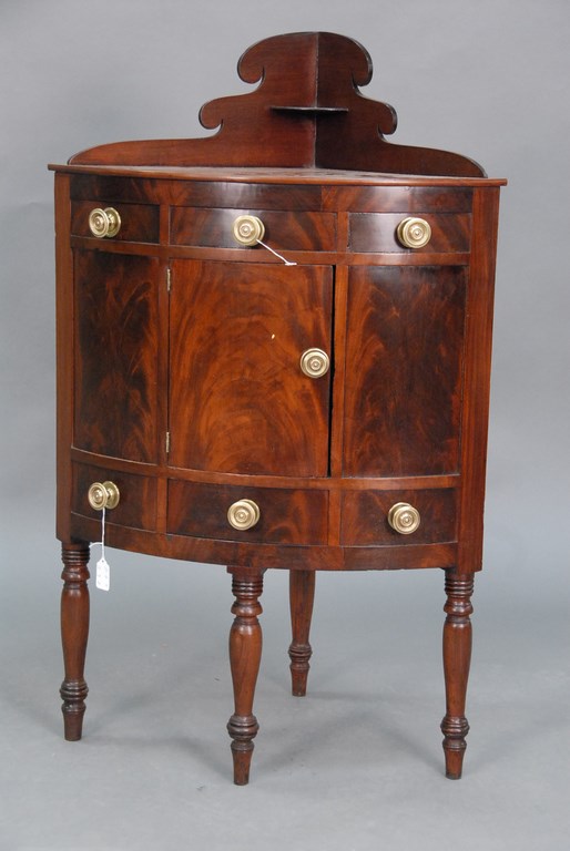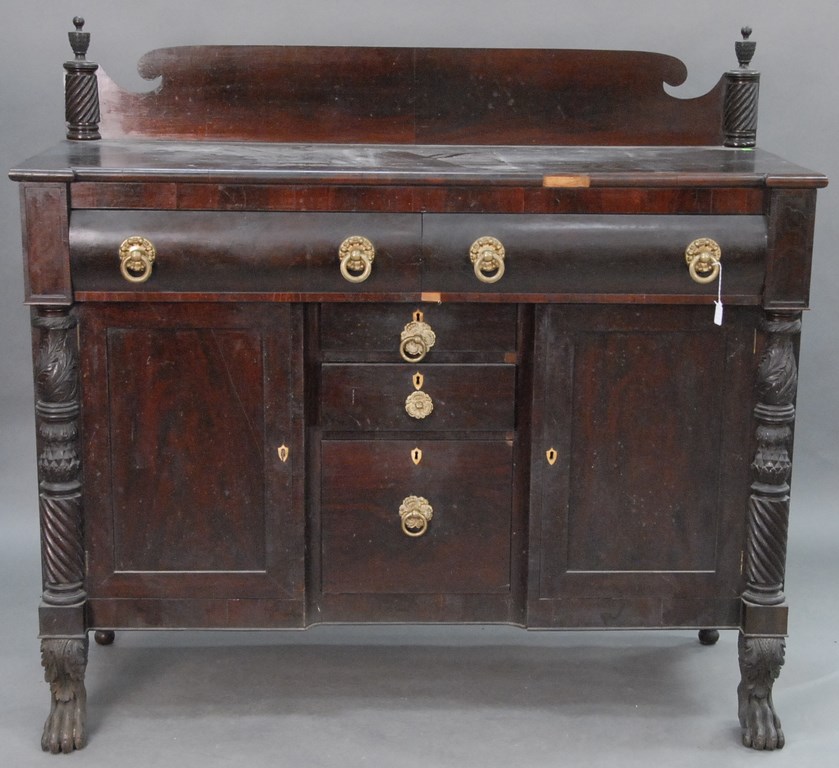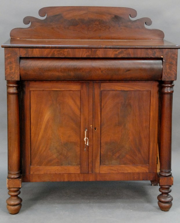 Empire mahogany sideboard having shaped backsplash and one drawer over two doors flanked by turned columns, all on turned feet. ht. 46in. wd. 46in. dp. 21in. Provenance: Brown Family, Windsor, Connecticut