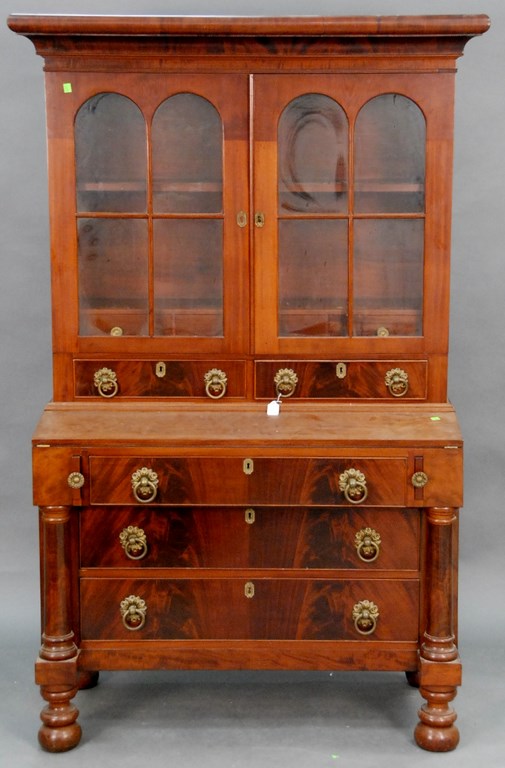Empire mahogany secretary desk in two parts, upper section with two glass doors over two drawers on lower section with flip lid writing surface over three drawers flanked by turned columns on turned feet, original embossed brass pulls, circa 1840. ht. 70in. wd. 41in. dp. 19in.