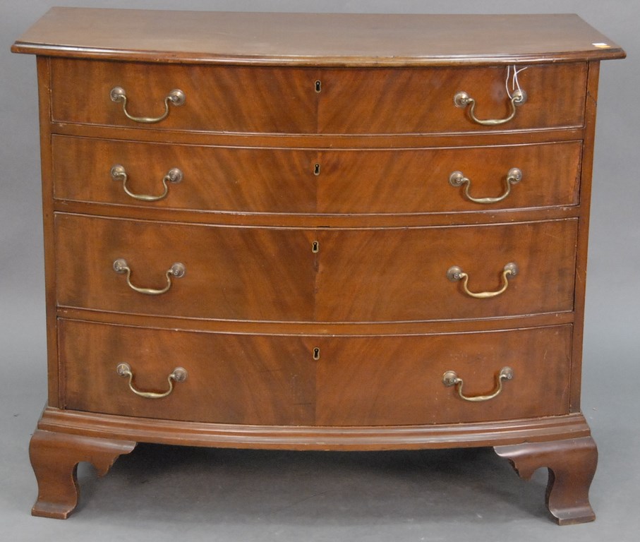 Chippendale mahogany chest having top with bowed front over conforming chest of four graduated drawers all set on ogee bracket feet. ht. 32in. wd. 39in.