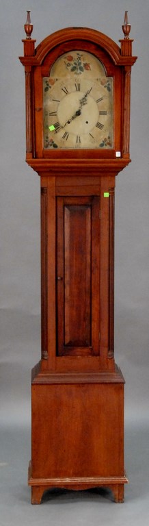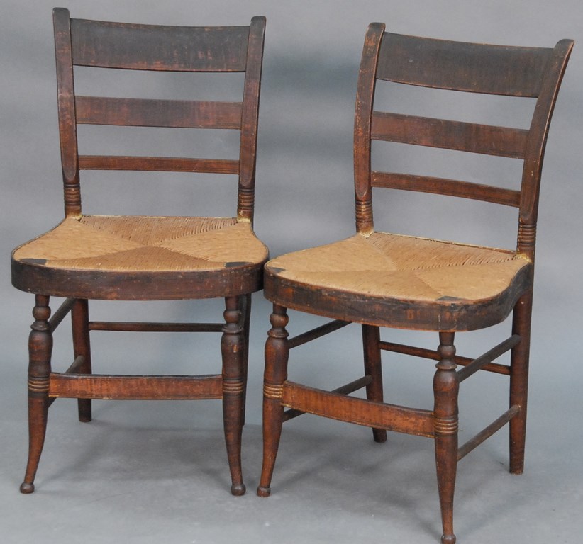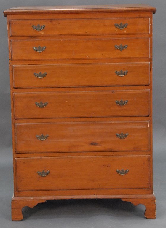 Sheraton chest, top with bowed front and cookie corners over conforming chest of four drawers with birdseye maple panels over center drop maple panel all on turned and fluted legs, probably Athol Massachusetts area, circa 1830. ht. 43in. wd. 42in. dp. 21in.