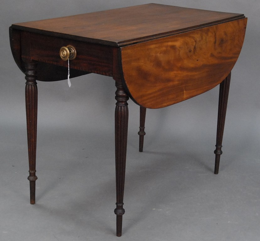 Sheraton mahogany drop leaf Pembroke table with shaped drop leaves, one drawer, and fluted legs ending in brass capped feet. ht. 29in. lg. 41in. wd. 32in.