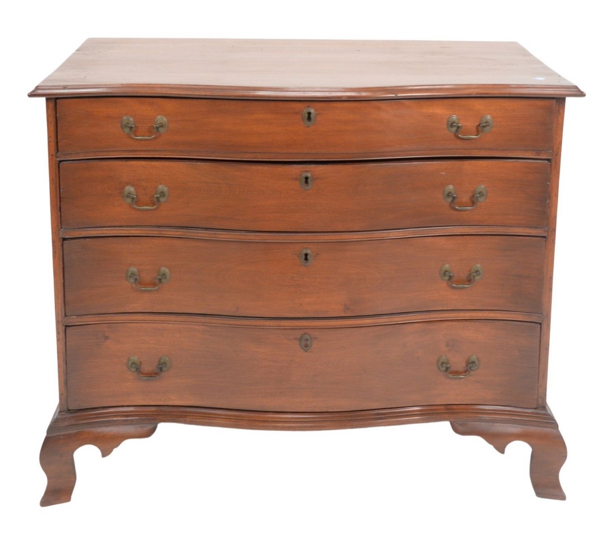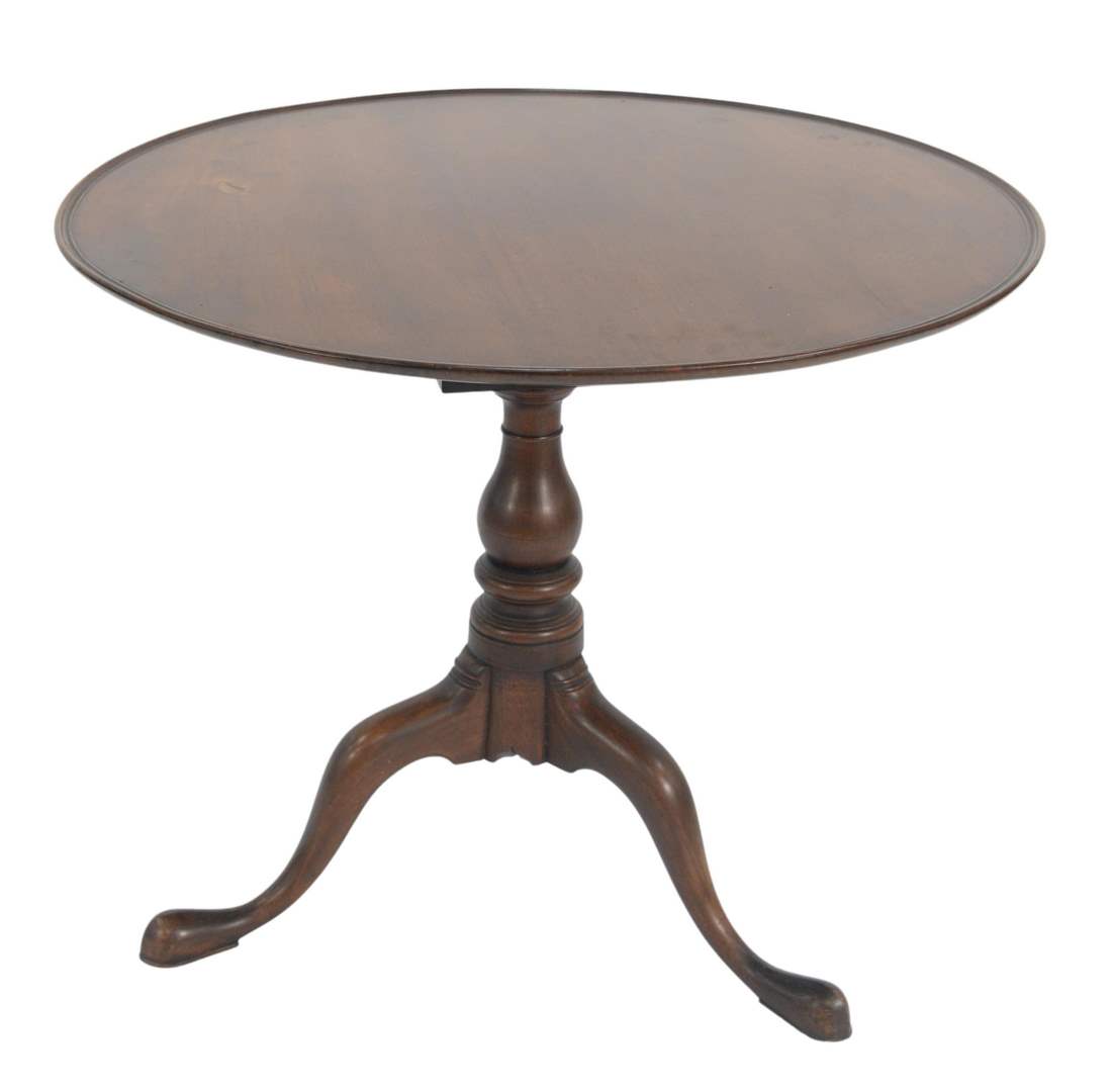 Mahogany Tip and Turn Tea Table, having dished top on birdcage unit on turned shaft ending in tripod base, circa 1750, attributed to the Chapin School, height 26 3/4 inches, top 32 7/8 x 33 7/8.
