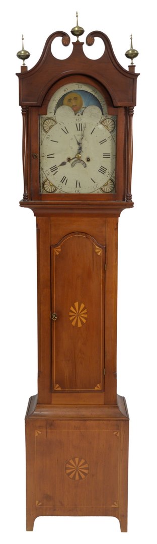 Federal Cherry Tall Case Clock, having tombstone painted dial and moon phase cage, broken arch top with three brass finials over door over base with bracket feet, case in manner of Deming, height 88 inches, one top arch repaired.