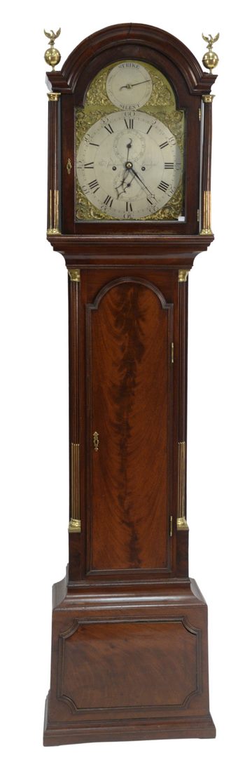 Thomas Jackson Mahogany Tall Case Clock having arched hood with brass eagle and ball finials, brass face marked Tho Jackson, London, brass stop fluting columns, height 85 1/2 inches.