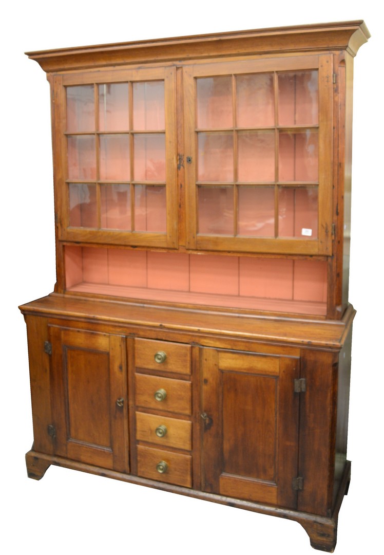 Walnut Two-Part Stepback Cupboard, top with two glazed doors over open shelf on lower section with four drawers and two doors, all set on bracket feet, probably Pennsylvania circa 1750, height 85 1/4 inches, total width 63 inches.
