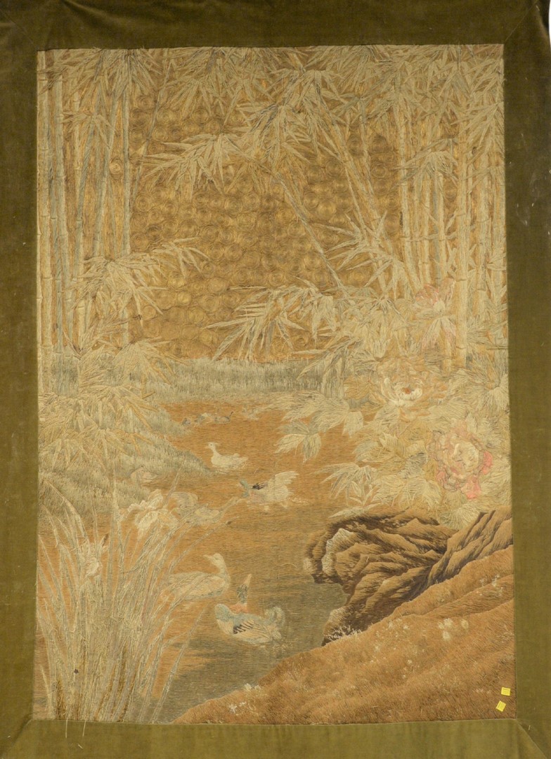 Large silk and gold thread embroidered wall hanging having landscape scene with ducks in a pond and bamboo trees, Meiji Period, having a Brandt Oriental Art Receipt dated March 27, 1999.