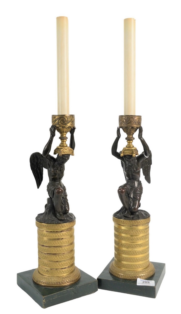 Pair of Bronze Candlesticks having a winged bronze man holding an urn and kneeling on plinth base, total height 23 1/4 inches. Provenance: From a Newport, Rhode Island historic home, in the same family since 1761.