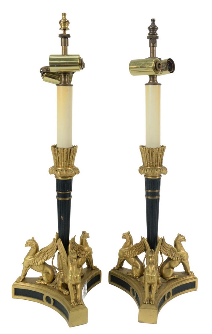 Pair of Bronze Candlesticks, having gilt bronze fletching over bronze shaft on tripod base with winged griffins, made into table lamps, height 18 1/2 inches.