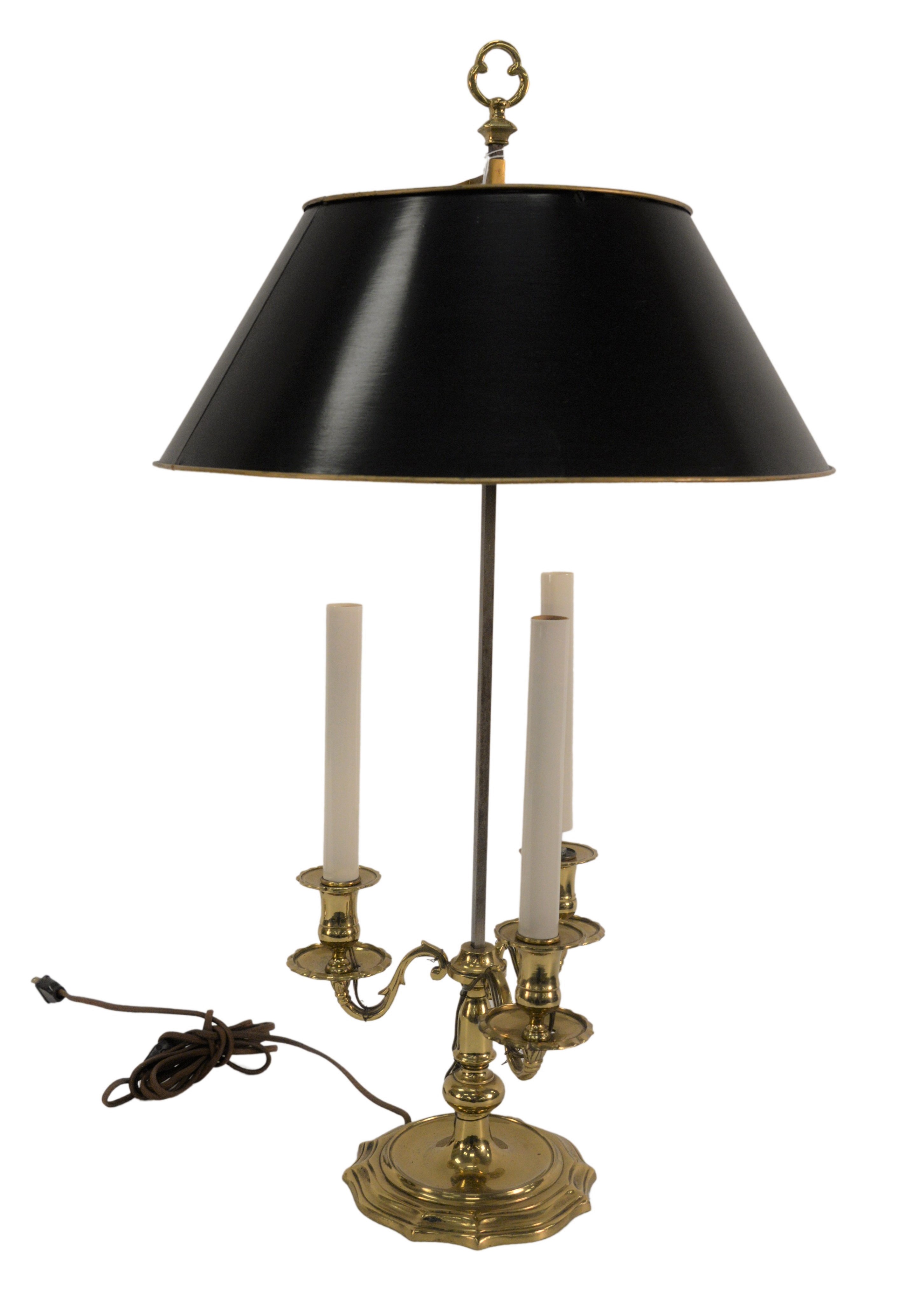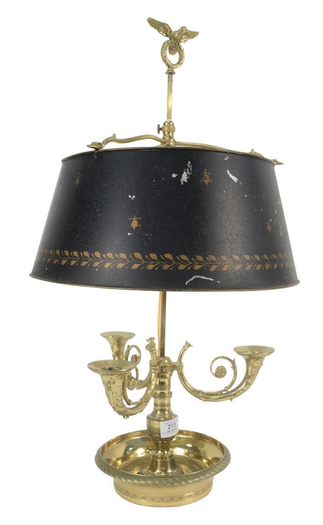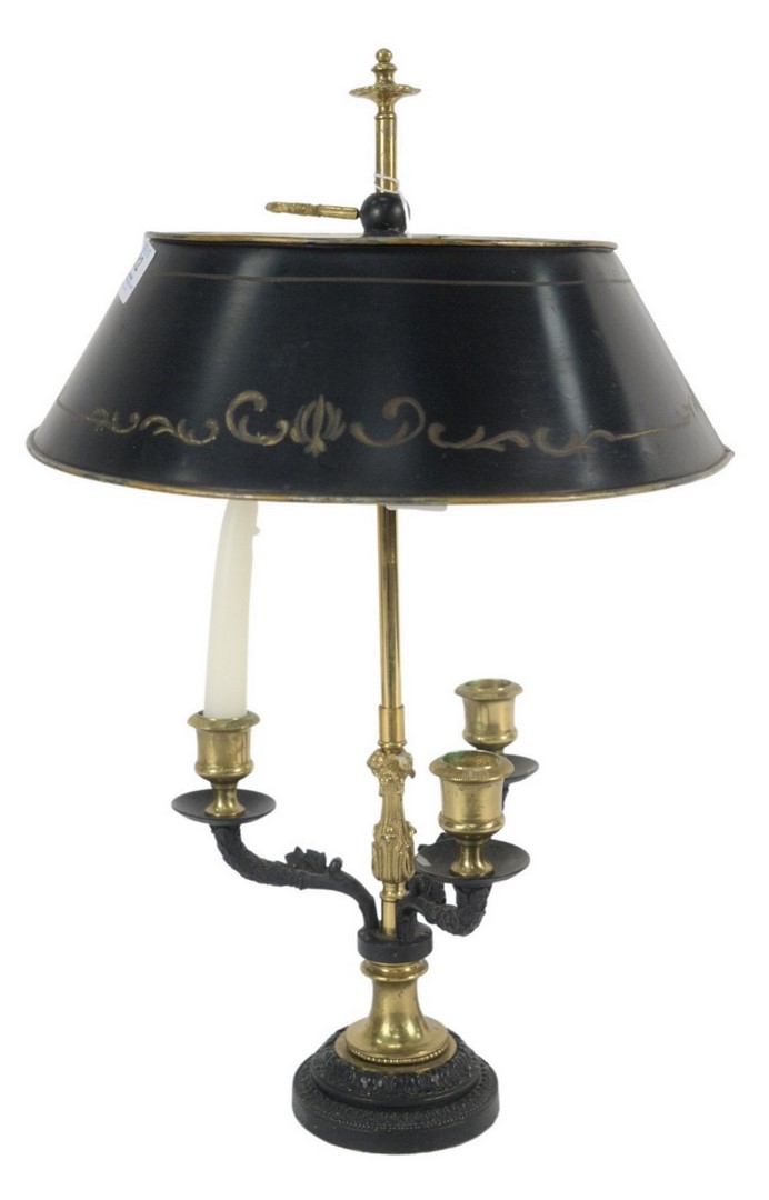 French Bouillotte Table Lamps with gilt brass with three arms and adjustable tole shade along with small brass and black three arm with adjustable tole shade, heights 26 inches